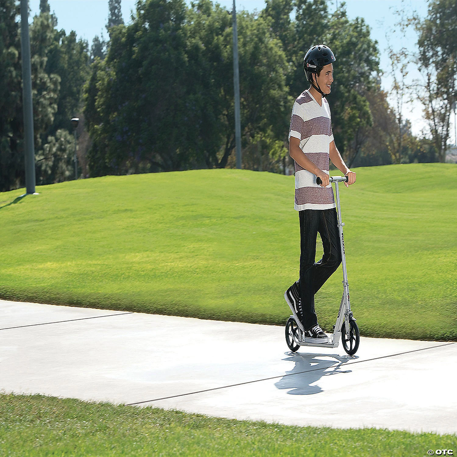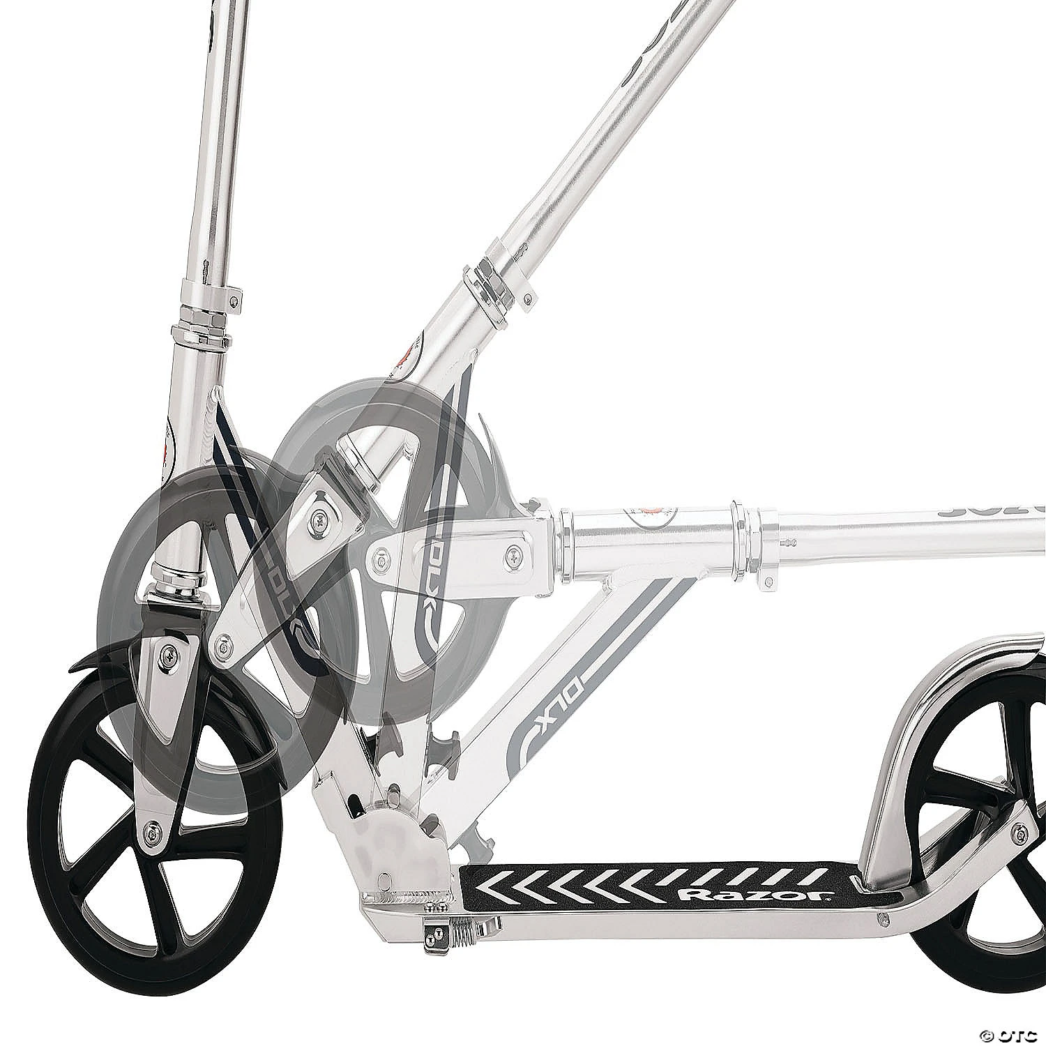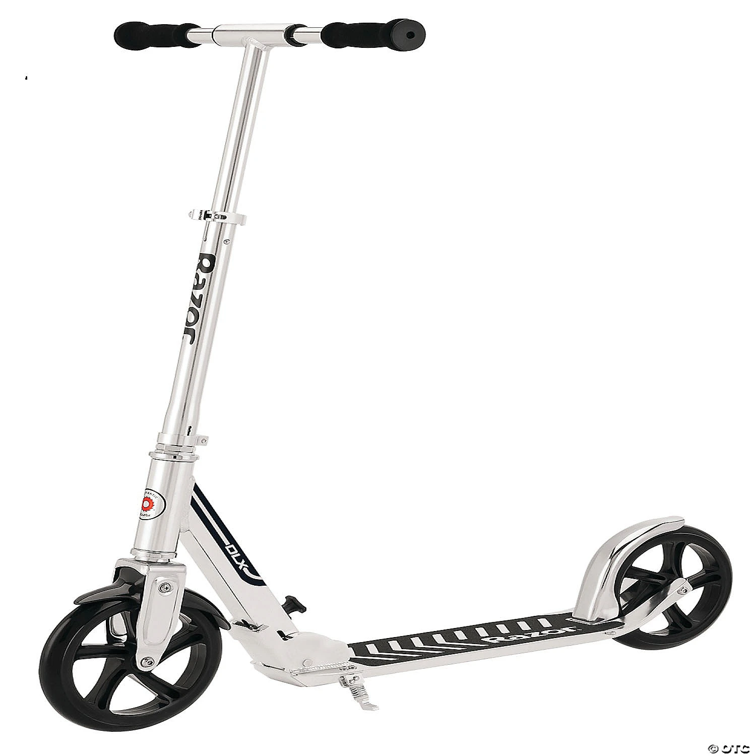 The Razor A5 DLX is the go-to ride for an on-the-go lifestyle. Building on our classic A5 Lux frame, the A5 DLX adds our patent-pending, anti-rattle handlebar and folding mechanism to deliver a solid, smooth ride. Combined with extra-large, 8” (200 mm) urethane wheels and super-strong, aluminum t-tube and deck, it ensures the smoothest, quietest ride around. No more rattling or vibration, so you can enjoy your ride with the king of comfort. The A5 DLX is perfect for quick rides, commutes or running errands, with its patent-pending, easy-folding system that makes the transition from ride to carry and storage effortless. The A5 DLX features our rear-fender brake for an effortless, gliding stop. Designed for riders ages 8 and up, weighing up to 220 pounds (100 kg). • Super-strong, adjustable, aluminum T-tube and larger deck supports taller riders.• Easily adjusted handlebars include soft, foam grips for enhanced comfort.• Extra-large, 8” (200 mm) urethane wheels provide a smooth ride.• Lightweight, easy-to-carry and an ideal companion as a commuter scooter.• Rear-fender brake makes for quick-and-easy, slow-and-stop when in motion.• Designed for riders ages 8 and up, weighing up to 220 pounds (100 kg). Special Shipping Information: This item ships separately from other items in your order. This item cannot ship to a P.O. Box. This item may be subject to additional processing days. ITEM IS NOT ELIGIBLE FOR EXPEDITED SHIPPING