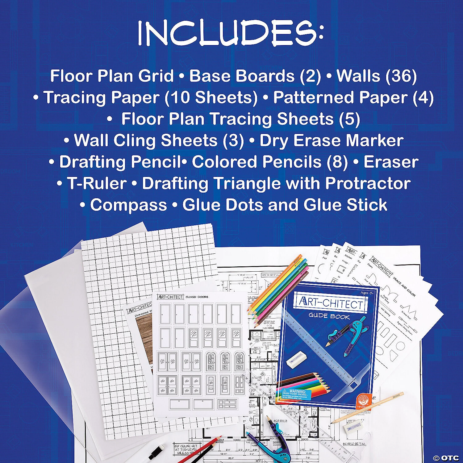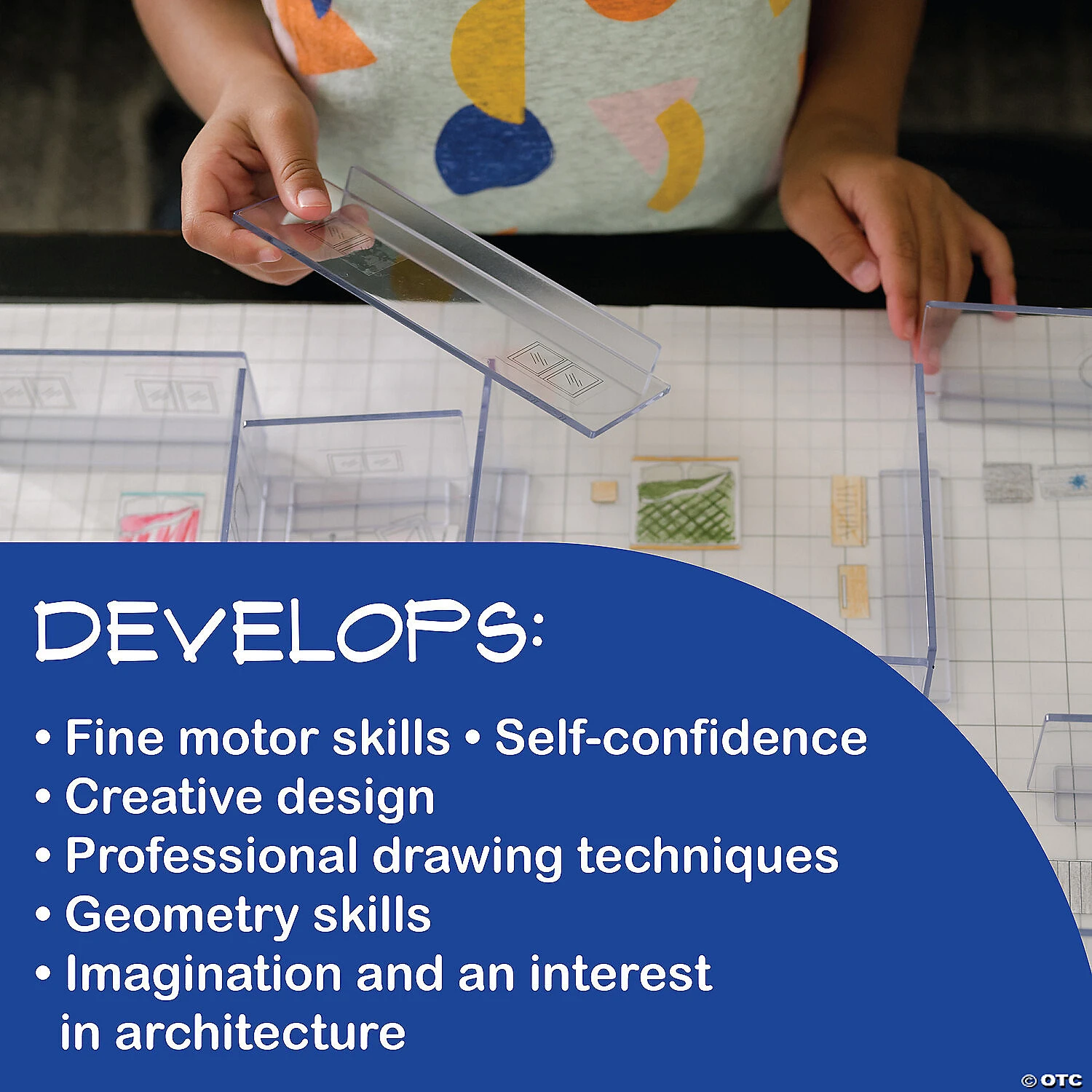 Kids learn real drafting skills as they build 3-D designs from the ground up. This introduction to architecture sparks the imagination as kids use real architectural tools like a drafting triangle, compass and more to design, furnish and decorate floor plans using the detailed guidebook, static-cling doors and windows, furniture templates, drafting paper, 18″ x 24″ acrylic work surface, art supplies and more. Includes:• Floor Plan Grid• Base Boards (2)• Walls (36)• Tracing Paper (10 Sheets)• Patterned Paper (4)• Floor Plan Tracing Sheets (5)• Wall Cling Sheets (3)• Dry Erase Marker• Drafting Pencil• Colored Pencils (8)• Eraser• T-Ruler• Drafting Triangle with Protractor• Compass• Glue Dots and Glue Stick