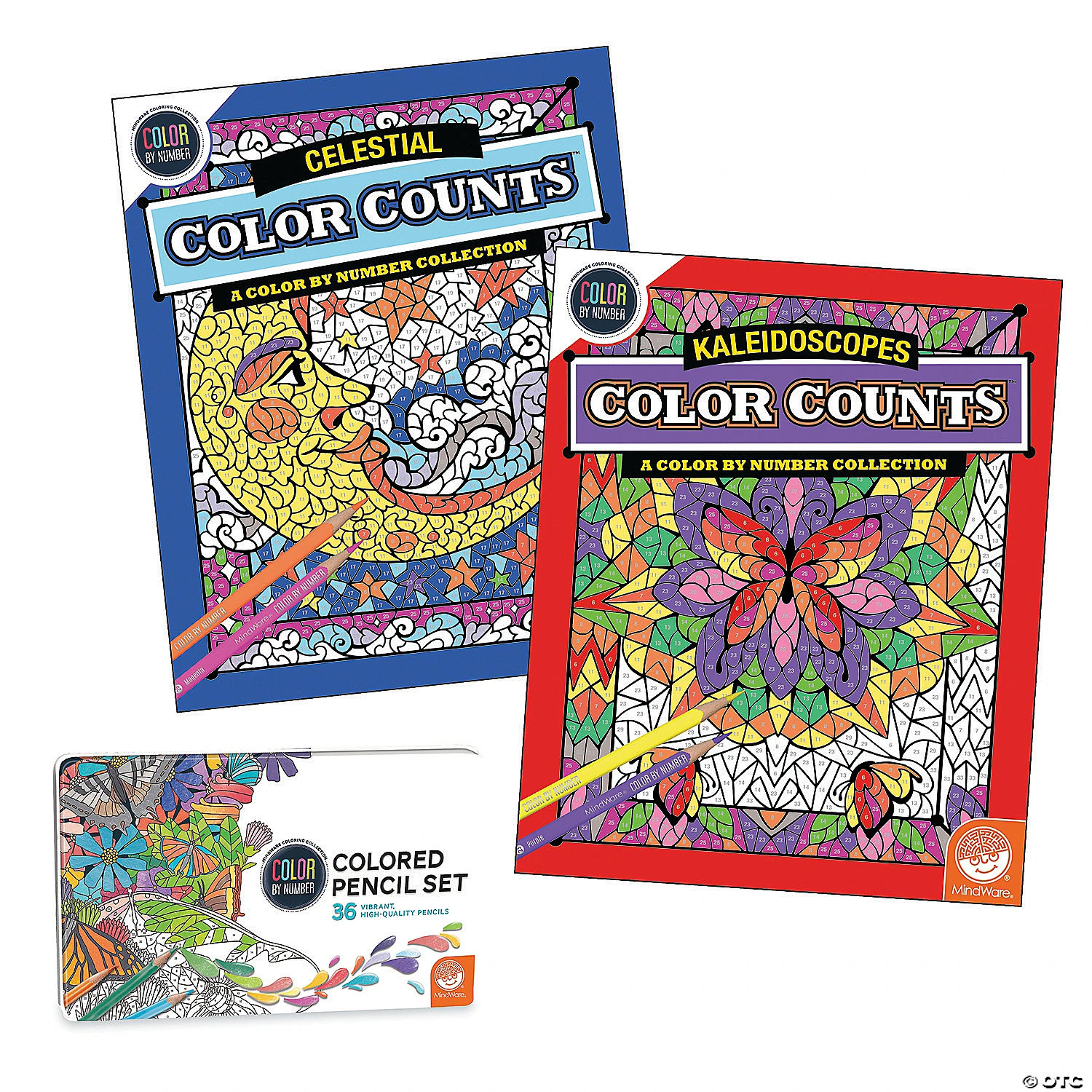 Our newest Color Counts coloring books incorporate a universal numbering system that pairs perfectly with our brilliantly-hued, 36-count Colored Pencil Set. Printed with coordinating numbers, the books and pencils are designed to make your coloring experience even more relaxing and enjoyable. Original, hand-drawn illustrations of kaleidoscopic and celestial scenes will reveal fantastic hidden details as you color. Once you’ve completed the numbered designs, try the un-numbered version of the illustration to add your own unique style. Each design, printed on artist-quality paper, creates a frame-worthy finished product! Both books feature 22 perforated pages including 8 fold-out pages that extend to a 10″ x 15″ size. Perfect for gift-giving, this set includes 36 pencils in an embossed tin. With a carefully selected assortment of classic colors and contemporary hues, the artist-quality pencils add both bold, precise details and soft blends to the colored page, while triangular barrels provide for a comfortable grip. Color names and numbers are printed right on each pencil.