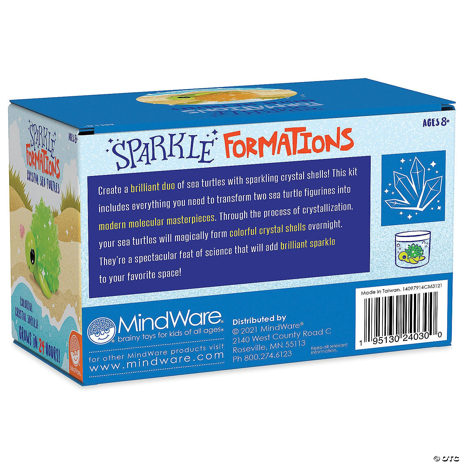 Magically grow your own sparkling sea turtles! This kit includes everything you need to transform two adorable turtle shapes into modern molecular masterpieces. Through the process of crystallization, your turtles will form colorful crystal spikes overnight. They’re a spectacular feat of science that will add brilliant bling to your favorite space!• Grow your own sparkly turtle décor!• Encourages an early, hands-on interest in science for kids• One of the coolest gifts for teens and tweens• Includes 2 turtle molds, 2 colors of crystal powder, 2 stirring sticks, growing container and instruction manual.Age Recommendation: Ages 8 and up