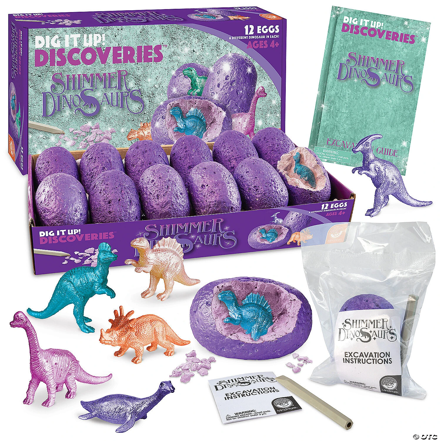 12 shimmering glittery dinosaurs hide within these 12 magical eggs, just waiting to be discovered! Once excavation is complete, learn about each unique dinosaur using the exploration guide. Did you know scientists do not know the true color of dinosaur skin? Could it have been shiny purple or sparkly pink? Who knows! Simply soak the clay eggs in water, then carefully chisel away the sedimentary material to reveal the shimmery dinosaur inside. • Each egg contains a different shimmery dinosaur toy• Helps promote an early interest in science and imagination for kids• The perfect activity for parties and groups • 12 eggs, chiseling tools and instructions