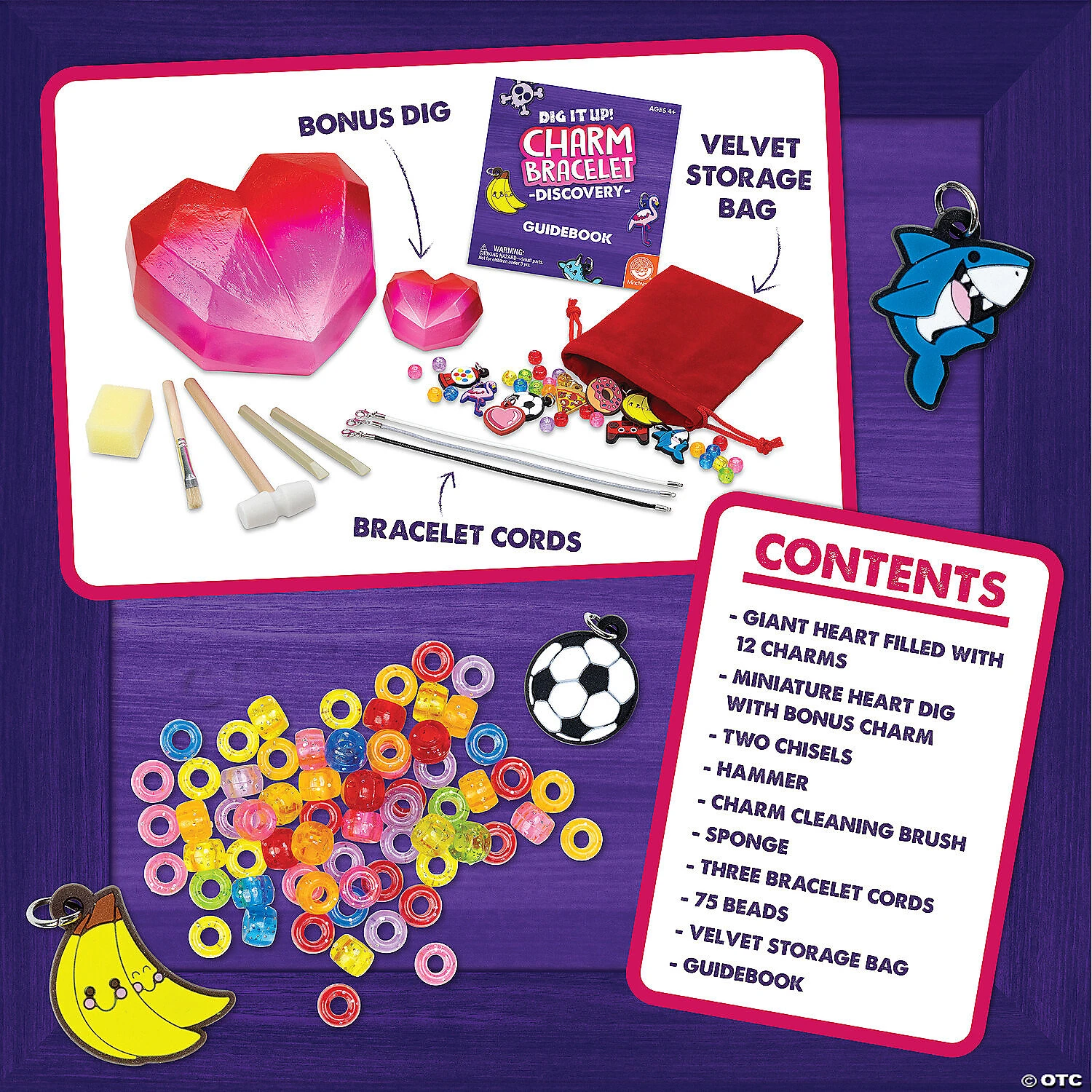 Inside this heart you’ll dig up cute charms, plastic beads and three bracelets: one for you and two for friends. Learn about the history of friendship bracelets, the benefits of having friends and even the significance of bracelet colors in the included guidebook. To get started, soak your dig project in a bowl or sink, chip away with your tools and discover what’s inside. This kit comes with a whole set of excavation tools for hammering, digging and brushing. Friendship bracelets have been beloved for many decades, and now it’s the next generation’s turn to get in on the fun!• Dig It Up! Giant Charm Bracelet Discovery contains 13 soft rubber charms to dig out and add to your friendship bracelets• Hands-on lesson in science that leads to fun with friends• 2 chisels allow you to dig with a friend or sibling• Includes giant heart filled with 12 charms, 2 chiseling tools, 1 hammer, 1 charm cleaning brush, 1 sponge, 3 bracelets, 75 beads, velvet storage bag, bonus heart dig with bonus charm and guidebookAge Recommendation: Ages 4 and up