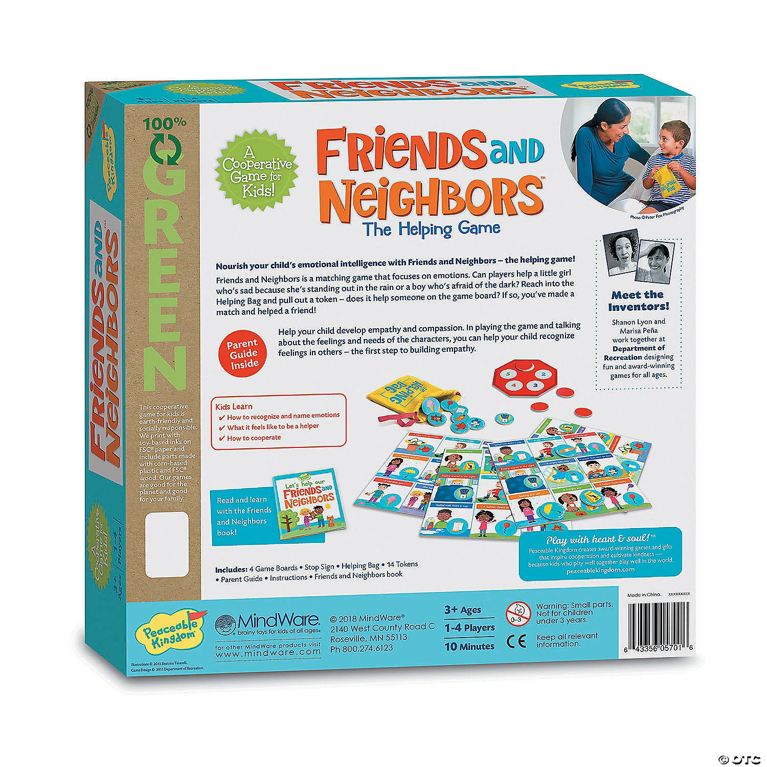Friends and Neighbors is a matching game that focuses on emotions. Can players help a little girl who’s sad because she’s standing out in the rain or a boy who’s afraid of the dark? Reach into the Helping Bag and Pull out a token – can it help someone on the game board? If so, it’s a match! In playing the game and reading about the feelings and needs of the characters, parents can help their children recognize feelings in others – the first step to building empathy. INCLUDES: 4 game boards, 14 tokens, 1 helping bag, 1 stop sign board, social and emotional intelligence parent guide and friends and neighbors story book.