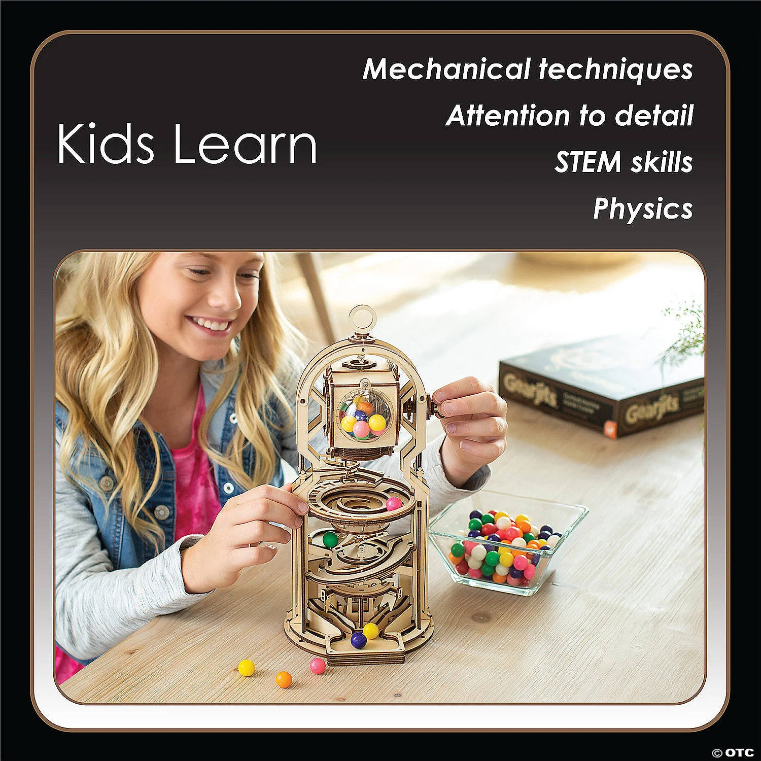 Build a working Gumball Machine Marble Coaster! This elaborate system of gears, rods and ramps has the nostalgic look of gumball machine with the thrill of a working marble coaster. The fun begins by filling the holding globe with colorful gumball marbles. Turn the handle to launch gumballs through the spiraling chute and down the twin ramps before collecting at the base.• Develops fine motor skills, creativity, perseverance and dexterity• Includes 6 wood sheets with 156 precut pieces, 1 handle, 1 dome cover, 18 rubber washers, 3 screws, 1 hex nut, 1 screwdriver, 2 springs, 13 steel shafts, wax sandpaper, illustrated instructions, and 21 gumball marbles• Assembled size: 12.75″ x 6.5″ x 6″• Average building enthusiasts can complete the puzzle in about 4 hours