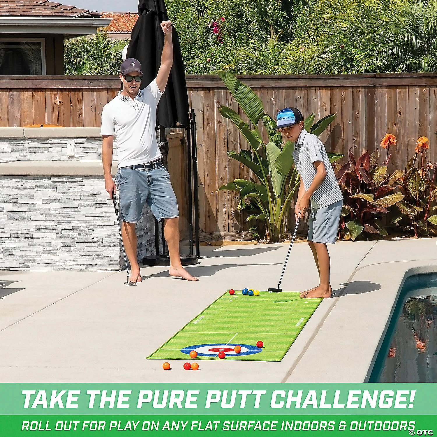 GoSports Pure Putt Challenge Curling & Shuffleboard blends the exciting game of both games with competitive putting for golfers of all abilities! The 10ft “putting green” features shuffleboard on one end and curling on the other for 2 fun putting games in 1. Includes 16 golf balls and scorecard. Both games mimic traditional shuffleboard and curling rules, but with a unique golf twist! 2-4 players can compete against each other to score the most points to win. Players can either putt to score points or aim to knock their opponent’s golf balls off the rug (full detailed rules inside). Now steup up to the Pure Putt Challenge! Special Shipping Information: This item ships separately from other items in your order. This item cannot ship to a P.O. Box. This item may be subject to additional processing days. ITEM IS NOT ELIGIBLE FOR EXPEDITED SHIPPING