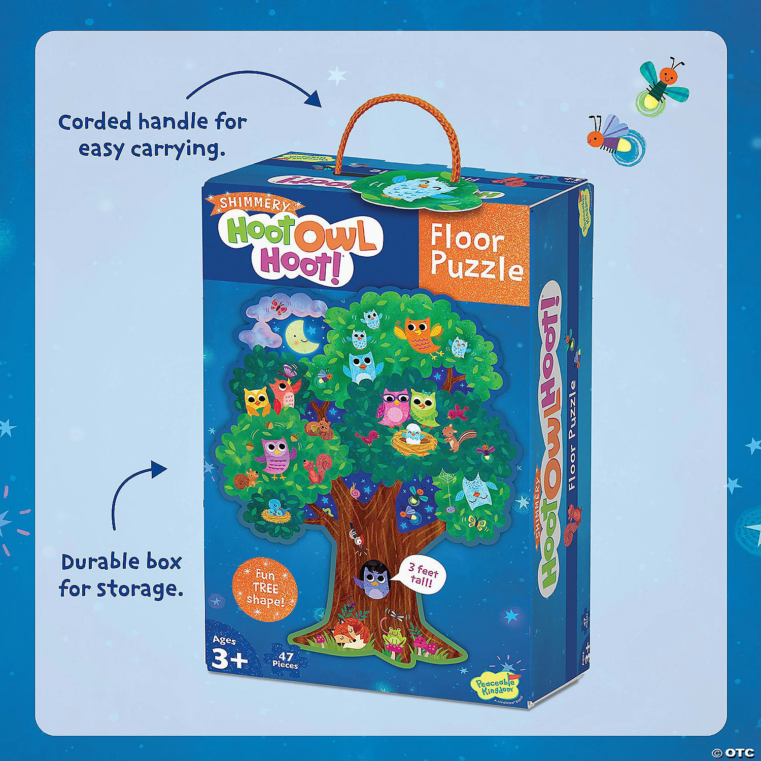 Have a hoot putting together this colorful floor puzzle! An interactive extension of the Hoot Owl Hoot cooperative game, this fun kids’ activity encourages visual recognition, fine-motor skills and problem solving. When not in use, simply store the puzzle pieces in the included box with convenient carrying handle. Great for classroom or at-home use!• Develops visual recognition, cooperation, fine-motor development, problem solving and cognitive skills• Kids use their bodies and minds together to complete the puzzle• 47 foil accented pieces• Finished puzzle measures 3 ft tall• Perfect for home or classroom use• Includes a storage box with a carrying cordAge Recommendation: Ages 3 and up
