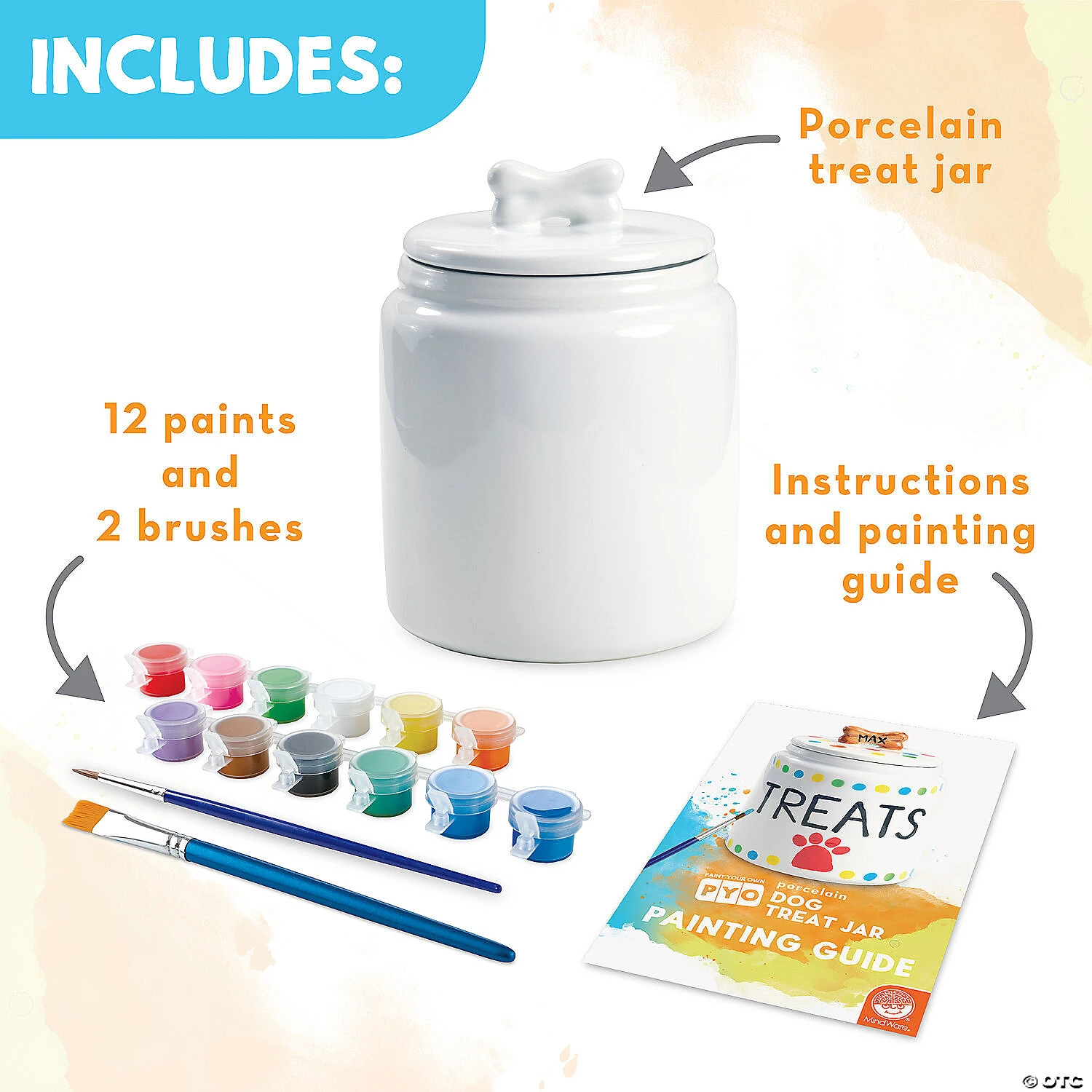 Budding artists can create their own designs on these treat jars, bake them for a long-lasting, high-quality look and then use their creations to hold dog biscuits and other canine treats. With a silicone seal on the lid to help keep goodies fresh, this DIY home décor is both beautiful and functional. What a sweet way to delight your favorite four-legged friends while nurturing creativity! • Paint Your Own Porcelain Dog Treat Jar features a 5” x 6.5” jar that holds approximately 40 ounces of treats• Develops creativity, hand-eye coordination and color mixing skills• Airtight lid keeps treats fresh• Wipe clean with dry cloth • Includes porcelain dog treat jar, 2 paintbrushes, 12 paints and painting guide