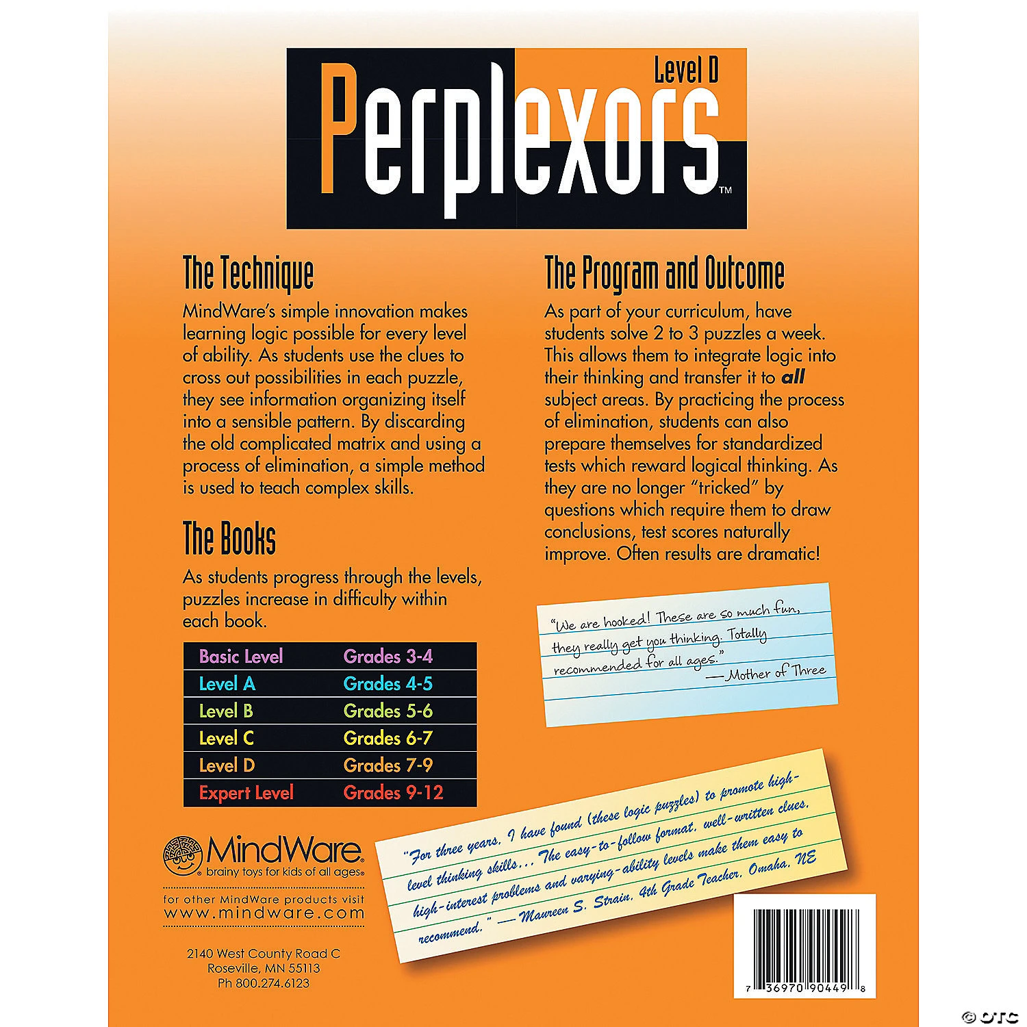 Pick up a pencil and sharpen your deductive reasoning skills with these challenging logic puzzles. Each Perplexor puzzle categorizes information and lists clues below. By using the “cross-out-and-circle” technique, you will practice logical thinking in order to find the correct answer. Perplexors: Level D (Ages 12 to 14) includes 48 full-page puzzles with solutions. This book is reproducible for single-classroom use. Please see the link below for a free printable worksheet sample. Printed in the USA. Download Sample Page