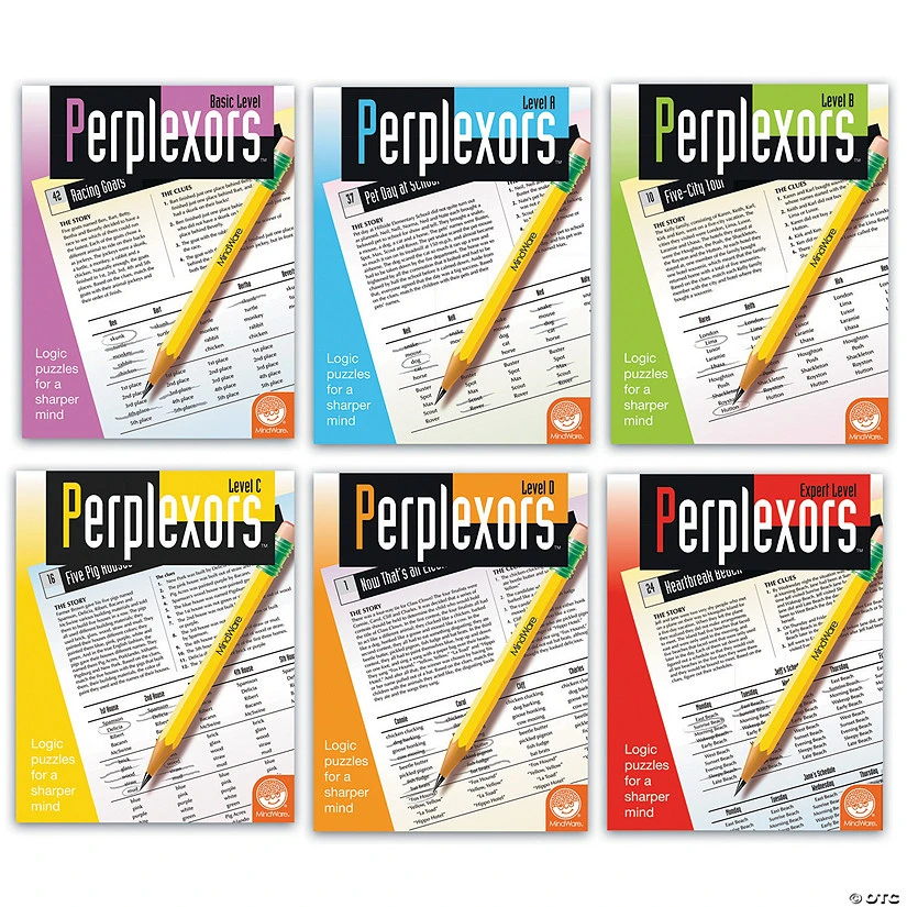 Pick up a pencil and sharpen your deductive reasoning skills with our best-selling logic puzzles. Each fun story problem can be solved through deducing information from each of the provided clues and using the “cross-out-and-circle” process of elimination to find the correct answer. Each book includes 46 puzzles, plus solutions in the back. Puzzles increase in difficulty through each level of the series!This kit includes:Perplexors Basic Level, great for grades 3 and 4.Perplexors Level A, great for grades 4 and 5.Perplexors Level B, great for grades 5 and 6.Perplexors Level C, great for grades 6 and 7.Perplexors Level D, great for grades 7 and up.Perplexors Expert Level, great for grades 9 and up.- Logic puzzles engage kids in deductive reasoning, logical thinking and testing skills- Great practice for standardized tests- The Perplexors series is a whole line of logic puzzle books – check out Grid Perplexors, STEM Perplexors, Animal Perplexors and more!- Reproducible for single-classroom use; includes free printable sample in the link below
