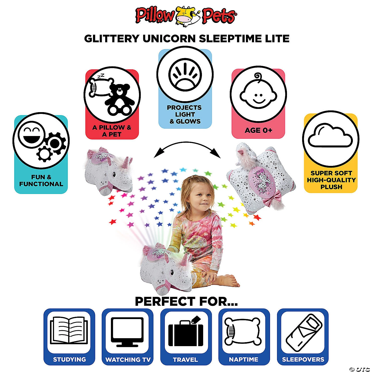 Pillow Pets presents this cute plush that shines colorful rainbow stars onto your ceiling! This Sleeptime Lite starts out as a fun pal to play with and then becomes a soothing nightlight. Easily turn your child’s bedroom ceiling into a starry night sky with the touch of a button. The Sleeptime Lite projects rainbow color lights that can be set to change slowly or quickly. It also has a built-in timer that will automatically shut the light off after 20 minutes, giving little ones enough time to drift off to sleep.GLITTERY UNICORN: This sparkly unicorn has silver stars and is shimmery all over, from the pink horn on her head to the pretty bow on her tail. She’s a glittery friend who is ready to play with any little princess!NIGHTTIME COMPANION: Pillow Pets presents super cute, soft, & adorable stuffed animals that project colorful stars at night. Toddlers, kids, teens, & adults love classic & collectible critters.STARRY COMFORT: This plush is a pal during the day and a soothing light projector at night! It’s a comforting travel friend for any child on road trips & airplanes. Also use as boy & girl bedroom decoration.BEST BUDDY: Children of all ages will love this original toy for play & as a companion for reading, watching television, studying, and sleepy nap time. Youth love to read with this cozy creature.SPECS: Official Pillow Pets item. The softest and highest-quality plush. BPA & Phthalates free. Size: 11in. Surface wash only. Projects light with 3 color modes and 20 min timer. Ages 0+. Special Shipping Information: This item ships separately from other items in your order. This item cannot ship to a P.O. Box. This item may be subject to additional processing days. ITEM IS NOT ELIGIBLE FOR EXPEDITED SHIPPING You may initiate a return for unused items within 30 days, if the items are in original packaging with all original materials included with the shipment.