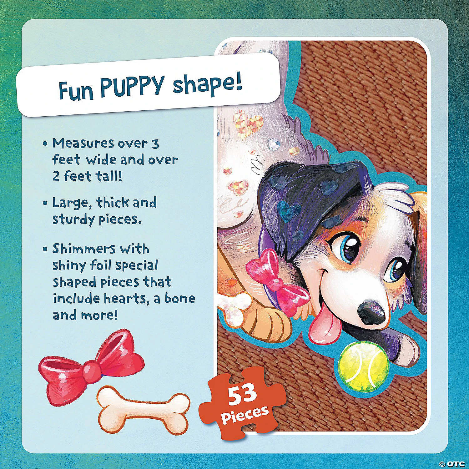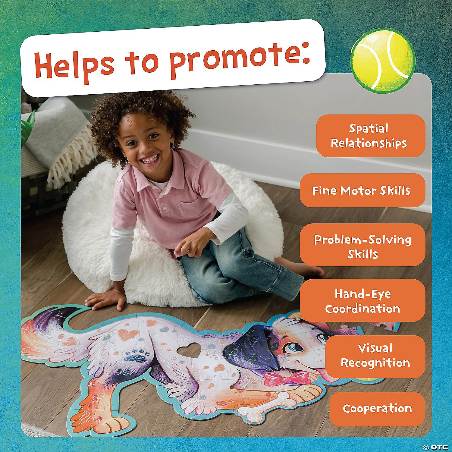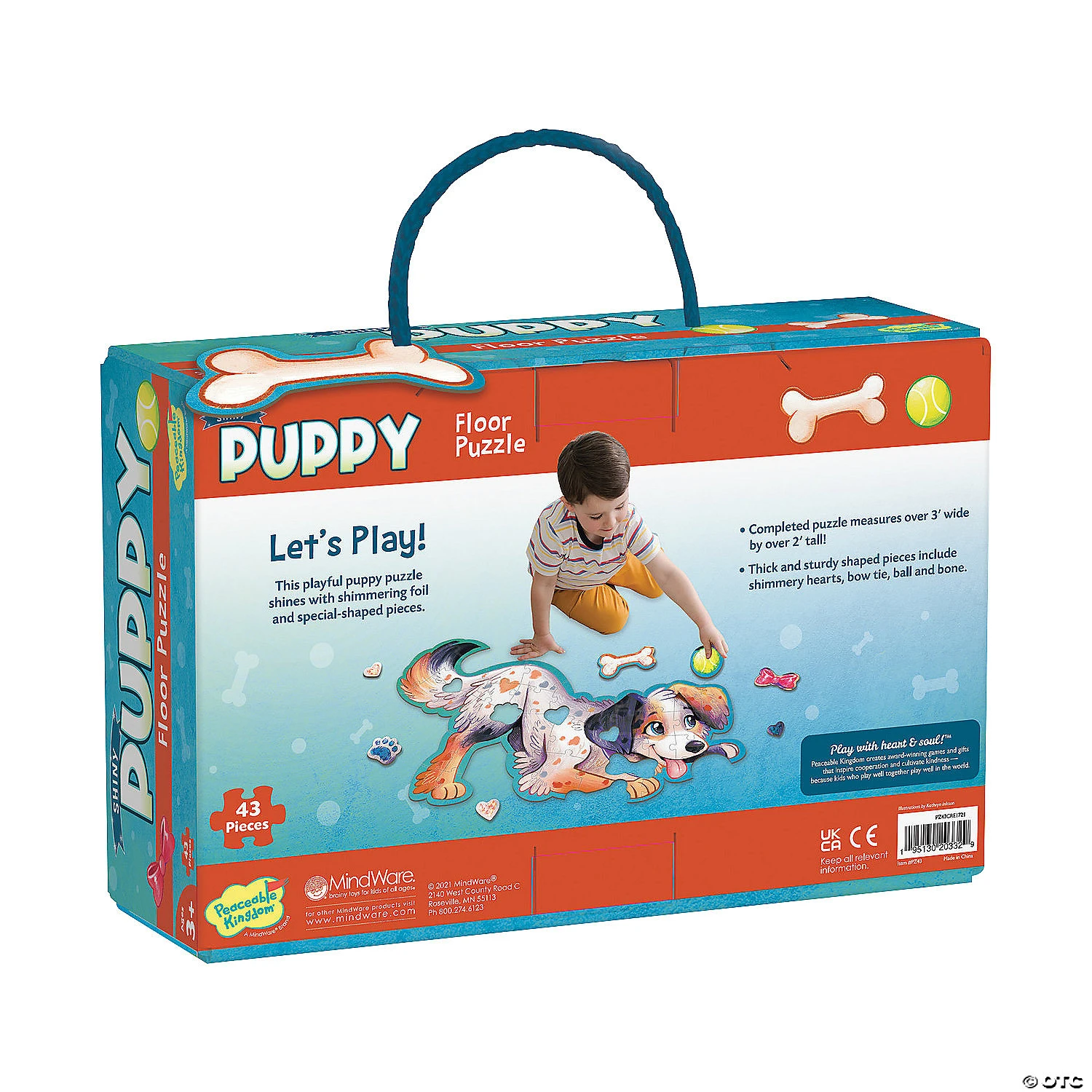 This playful puppy floor puzzle features shiny gold foil accents and uniquely shaped pieces like a bone, paw print and more. Complete with large, durable pieces that can be assembled time and time again, this fetching puzzle activity teaches visual recognition, cooperation, fine-motor development, problem solving and cognitive skills. The included sturdy box comes with a corded handle so kids can take their fun with them on the go!• Giant puppy floor puzzle with shiny foil accents will have kids howling with delight!• Develops visual recognition, cooperation, fine-motor development, problem solving and cognitive skills• Ideal for classrooms or at home• Includes 43 foil-accented pieces that measure over 3’ wide when assembled, plus a box with a carrying cord.Age Recommendation: Ages 3 and up