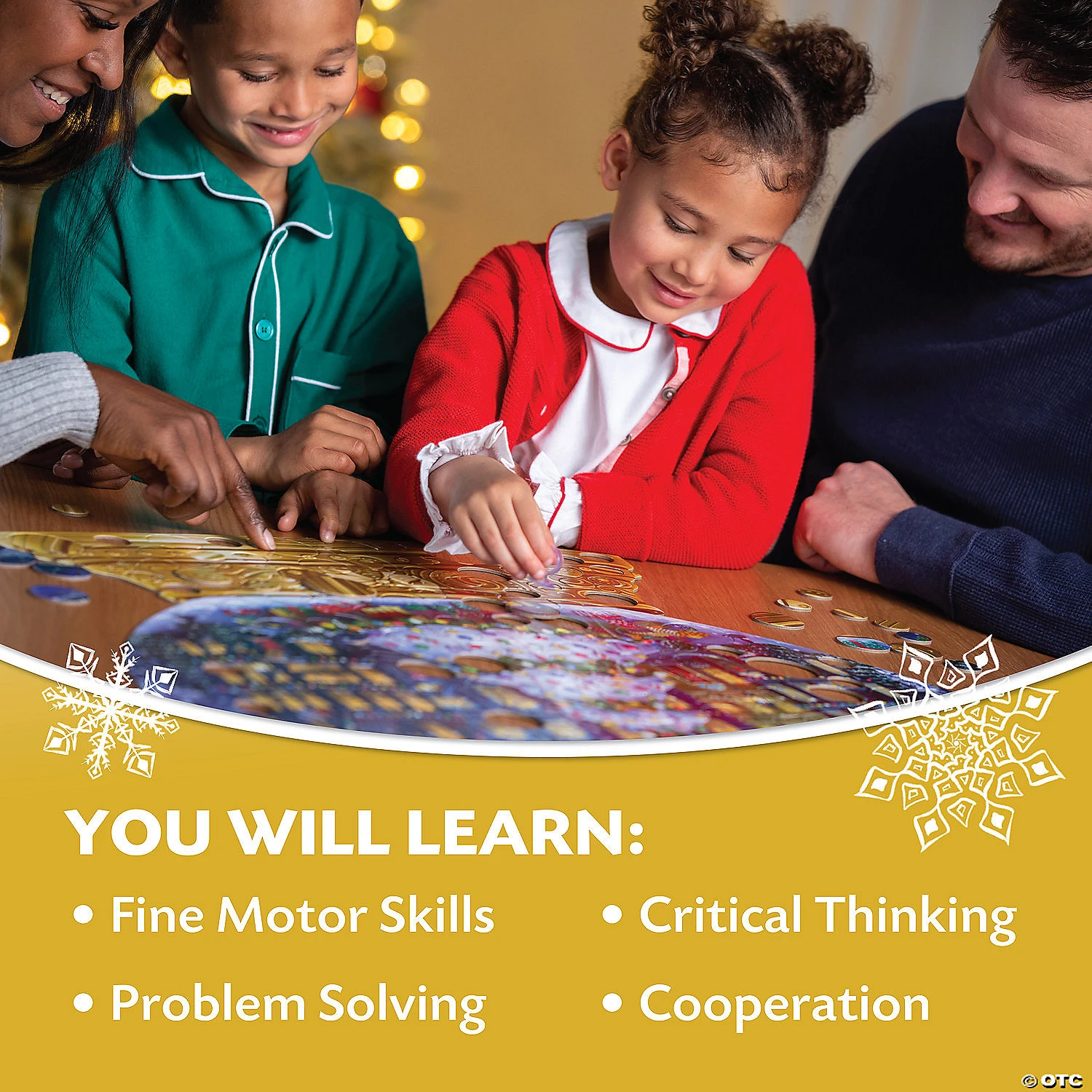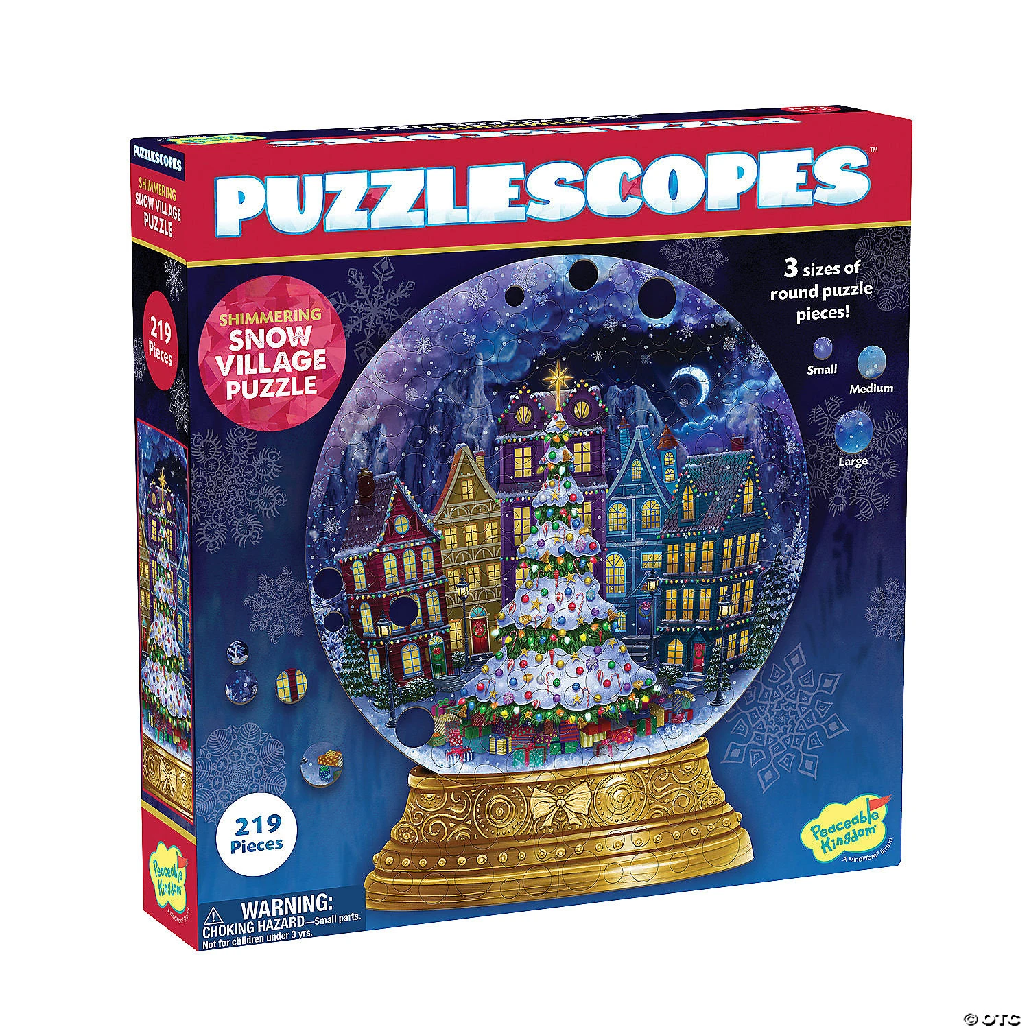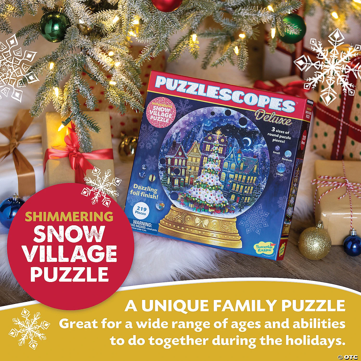 Complete with three different sizes of circular pieces and a suction cup to spin and position those pieces into place, this puzzle is a fun new twist on jigsaw puzzles! Gather the whole family to work on this puzzle that’s fun for people of all ages and abilities. Whether you’re brand new to puzzles or have put together plenty in your time, you can enjoy the unique challenge of fitting and spinning these circular pieces into place as you boost fine-motor skills, problem solving and critical thinking. When all the pieces are in place, marvel at the beautiful winter village snow globe scene you’ve created!• Unique activity for home or school• Kids learn visual recognition while developing fine motor, problem solving and critical thinking skills• Includes 219 pieces and suction cup• Completed puzzle measures 26″ x 31″