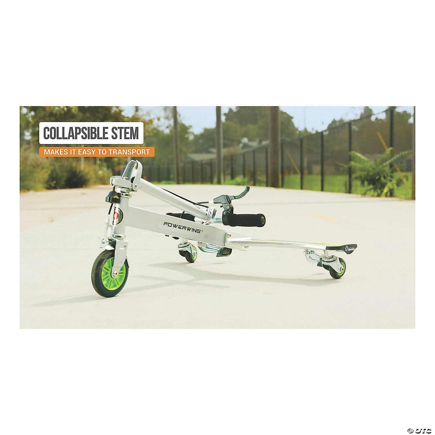 Your child can cruise around the neighborhood in style with this impressive Razor Powerwing DLX Scooter. It features a bright two-toned design with sleek black accents. This Razor Powerwing scooter can accommodate taller and heavier riders. Your child can use it to master sideways drifting and 360-degree spinning. This caster scooter is lightweight and folds up for easy transporting to a park or other play area. It has an adjustable handlebar and an innovative 3-wheel design for added balance. Even beginning riders can feel safe on this deluxe model. Urethane wheels allow this scooter to glide smoothly on a variety of surfaces. The patent-pending brake system and loop-out stoppers of this sleek Razor Powerwing DLX Scooter also provide for enhanced control. No pushing is needed for your child to enjoy heart-pumping side-to-side motion capabilities. This Razor Powerwing scooter is made for children 6-years-old and up.• Designed to accommodate taller and heavier riders• Easy-to-ride three-wheeled caster scooter design• 120mm urethane front wheel, 64mm urethane rear wheels for smooth riding on a variety of surfaces• Razor Powerwing scooter with adjustable handlebar height feature• Folding mechanism for easy transporting and storage• Features a sturdy steel frame• Heart-pumping side-to-side motion capabilities• No pushing needed• Two-toned design with sleek black accents• The Razor Powerwing DLX Scooter features a patent-pending brake system with front-hand control brakes• Loop-out stoppers also help provide your child with enhanced control• Some Assembly required • Product Dimensions. 27.3 x 18.6 x 31.6”H Weight: 11.15 Special Shipping Information: This item ships separately from other items in your order. This item cannot ship to a P.O. Box. This item may be subject to additional processing days. ITEM IS NOT ELIGIBLE FOR EXPEDITED SHIPPING