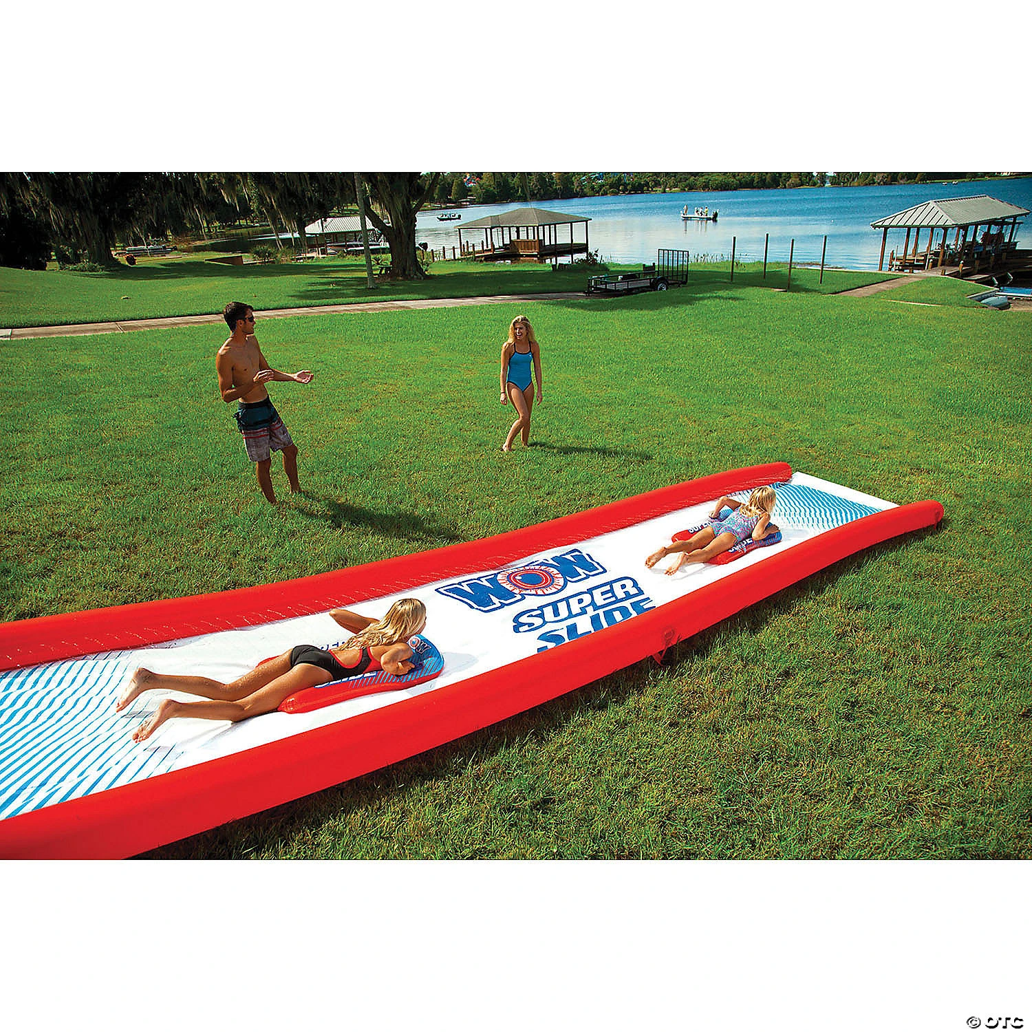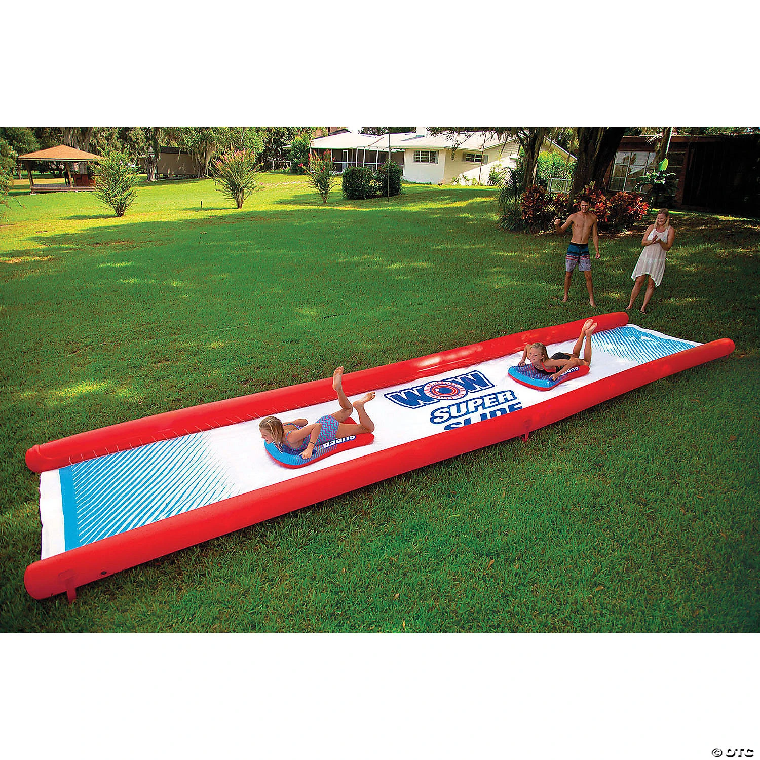 Looking for something special for your kid’s next backyard birthday party? We think we have the perfect party favor for you. The WOW Super Slide is a giant 25′ x 6′ water slide for the lawn that will keep the kids entertained all afternoon long. We got tired of all the cheap lawn water slides out there that were barely lucky to last a whole day, so we decided to build our own and back it by our WOW 1-year warranty. The WOW Super Slide is made from extra thick, heavy-duty, super-slick embossed PVC that will help you slip and slide all the way to the end. In fact, it is more than twice as thick as most of the slides you will find in the market. And no need to add dish soap to keep this slide slippery. Our zig-zag patterned, 25′ embedded sprinkler system, connects to the standard backyard hose, runs the length of the slide and has 100% water coverage so no dry spots. We also built it with sidewall pontoons to keep the water on the slide as well as your kids! Our favorite feature is the overlapping design, so you can purchase 2 or more slides and connect them all together for an even longer slide and twice the fun! Each slide comes with 2 Mega Sleds to cushion the fall and make the slide even more slippery. There, you now have everything you need to put on a great summer backyard party for your kids. Special Shipping Information: This item ships separately from other items in your order. This item cannot ship to a P.O. Box. This item may be subject to additional processing days. ITEM IS NOT ELIGIBLE FOR EXPEDITED SHIPPING